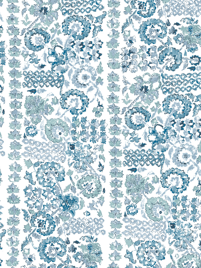 Offered in four delightful colourways, this intricate print is based on the delicate stitching of an appliqued waistcoat. Its embroidery-style florals are built by gently layering graduating tones, while its lengthening vertical columns give the impression of height.
