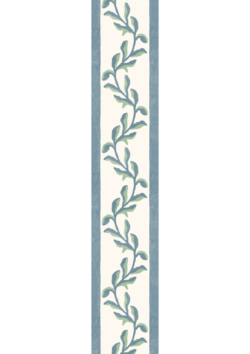 This delicate leaf motif was inspired by the intricate decorative details of Mediterranean interiors. Reimagined as a trailing wallpaper border, it is beautifully printed in soft tones of ‘green and blue’ or ‘red and blue’ on an off-white ground. Style it with its coordinating Mariana wallpaper or use independently on plain walls around door frames, skirtings, and cornices for a statement look.