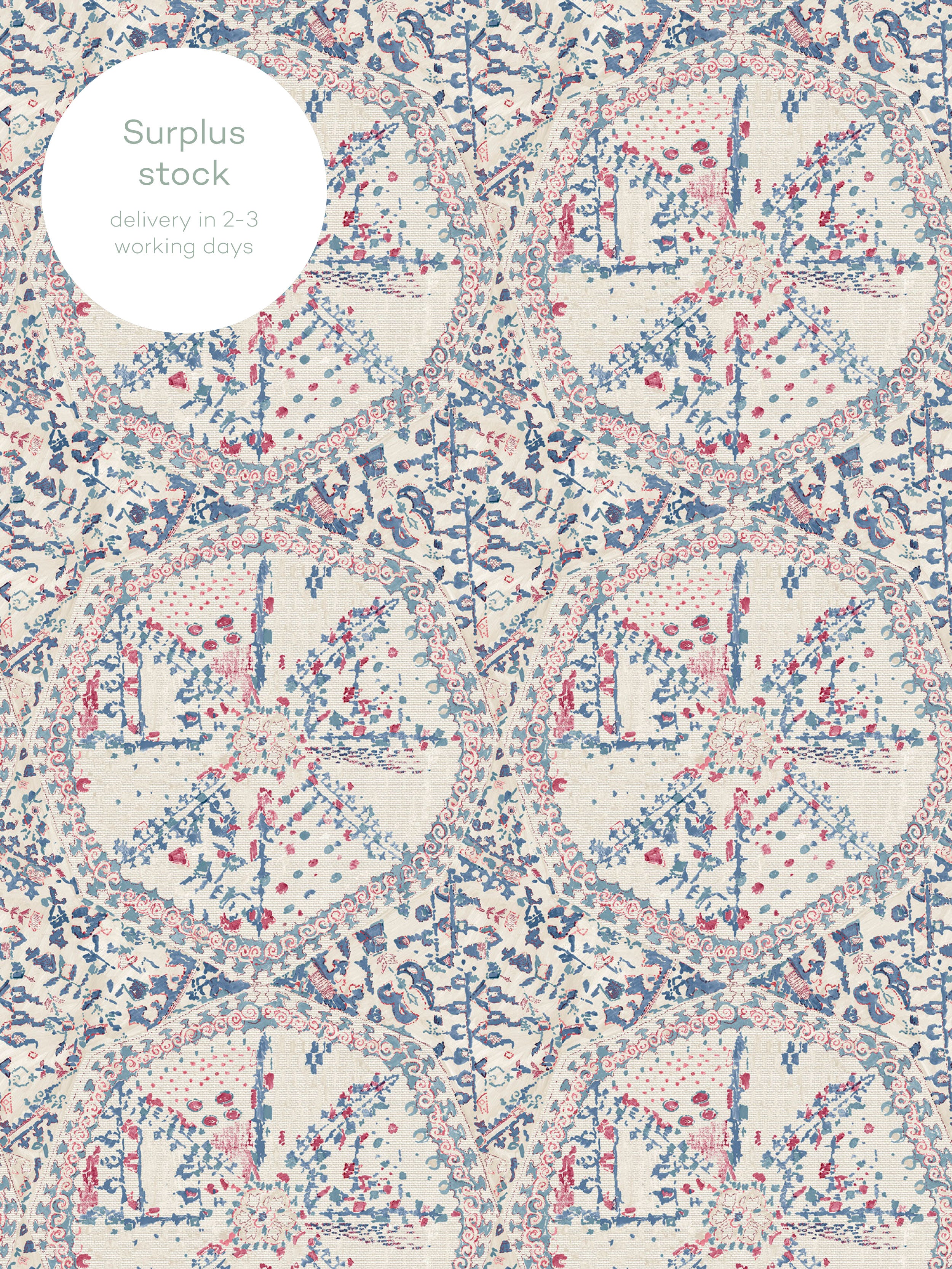 At once dramatic in scale yet intricately detailed, this gentle rendering of a traditional suzani manages to capture the textural elements of the original antique document. Colourings in gentle blue and pink bring a softness and usability to its super-sized repeat.